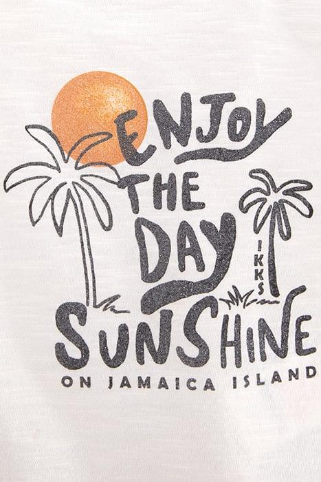 Palm Trees, The Sun And An Enjoy The Day, Sunshine On Jamaica Island Slogan Are Printed With A Glittery Look On The Front Of This Baby Girls’ T-Shirt. It’S In Organic Slub Cotton With Sleeves Finished With Pretty Ruffles With Gold Satin Stitch To Make It Stand Out.