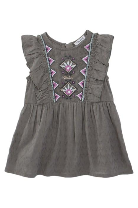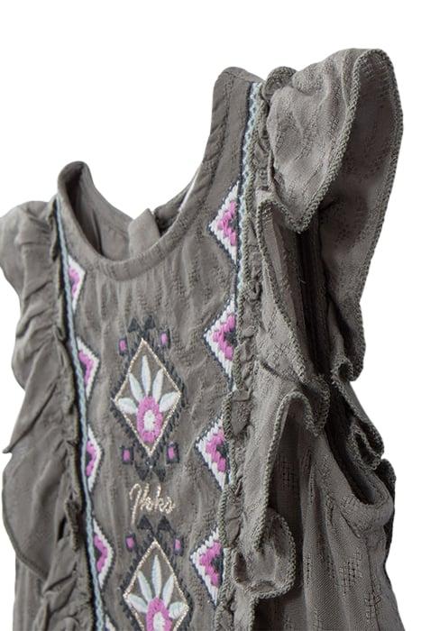 This Baby Girls’ Dress Has Boho Inspiration With A Mix Of Khaki Chevron Motif Jacquard, Ruffles And Ethnic Embroidery On The Dickey.