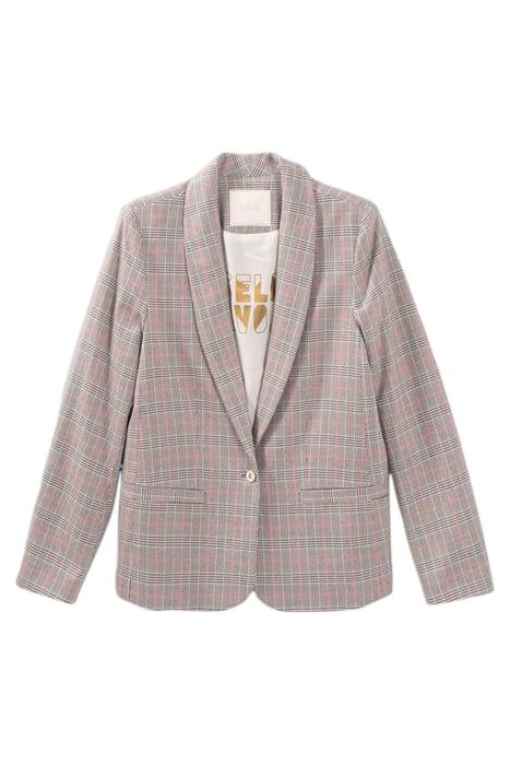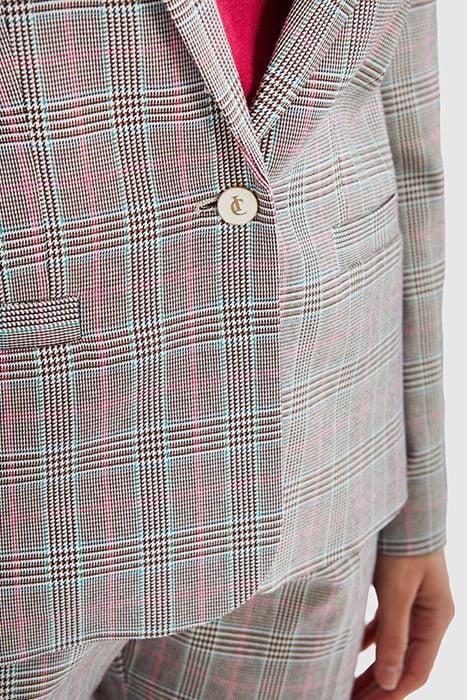 Women’S Navy Suit Jacket Shawl Collar, Long Sleeves 2 Side Pockets, Check Fabric, Slogan Lining 1 Signature Ic Button To Fasten