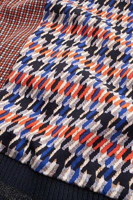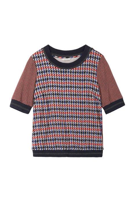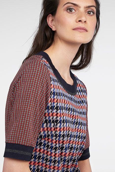 Combineer twee ruitpatronen, pied-de-poule en pied-de-coque, met elkaar en zie hier het resultaat. De top heeft op de mouwen, boord en op de halslijn een fijne lurex rib met strepen voor een sportieve touch. Draag het op de pied-de-poule broek uit de Sandwich collectie voor een spannende look.