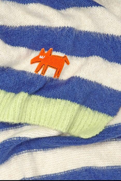 Striped Knit Scarf In Blue. Customized Model With Embroidered Lola Logo.