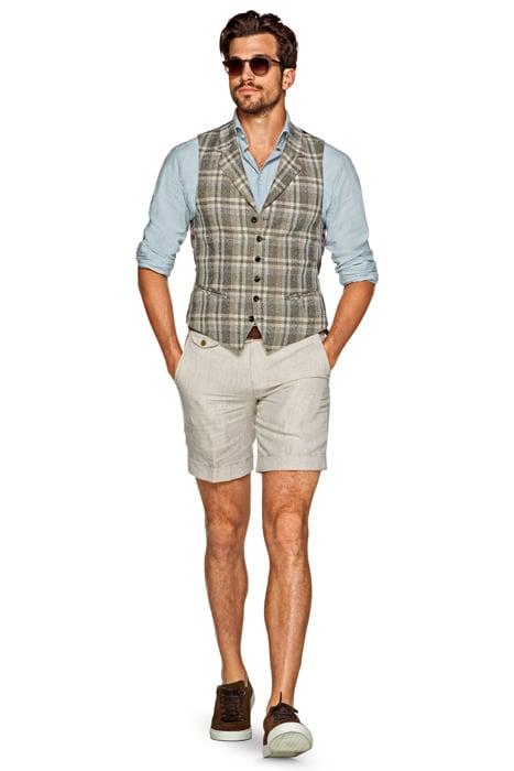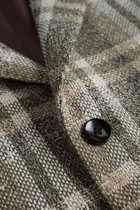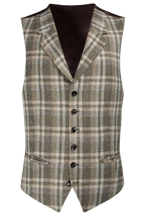 • Tailored to a slim fit from a blend of silk, linen, and cotton by Ferla, this green 6-button waistcoat features jetted pockets, rear adjustment straps, small notch lapel, and strong check pattern.
