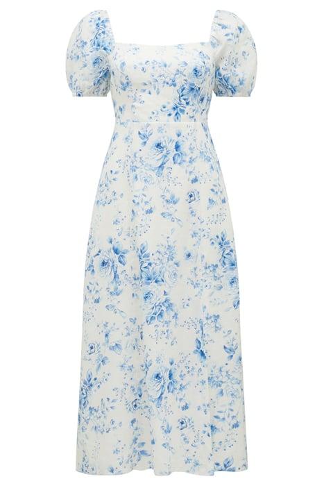 CARSON LINEN SQUARE NECK MIDI DRESS BLUE VICTORIA FLORAL