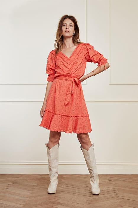 Short Dress With Wide V-Neck And Short Sleeves. Crissy Dress Has A Belt Tie And Ruffle Details On The Body, Sleeves And Bottom.