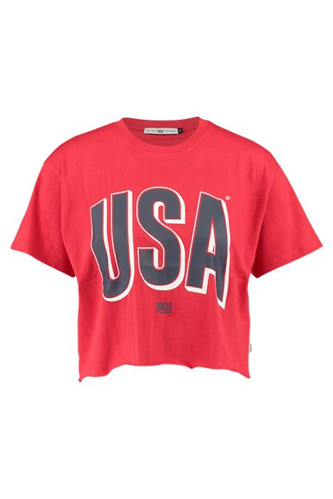 America Today T-Shirt For Women. The Elvy Usa Is A Cropped T-Shirt With A 'Usa' Print Print On The Front And A Curly Hem At The Bottom. .