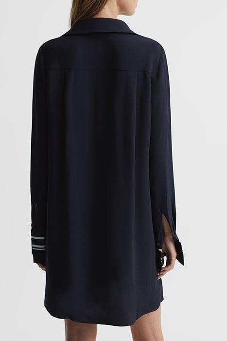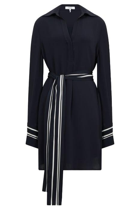 The Feya Dress Is A Unique Piece Designed With A Striped Tie Detail That Can Be Worn Around The Neck, Or Removed And Used As A Self-Tie Waist Belt. The V-Neckline And Mini Length Lend A Sense Of Allure, With The Oversized Cuffs Adding Impact To The Look. Simply Style With Heels.