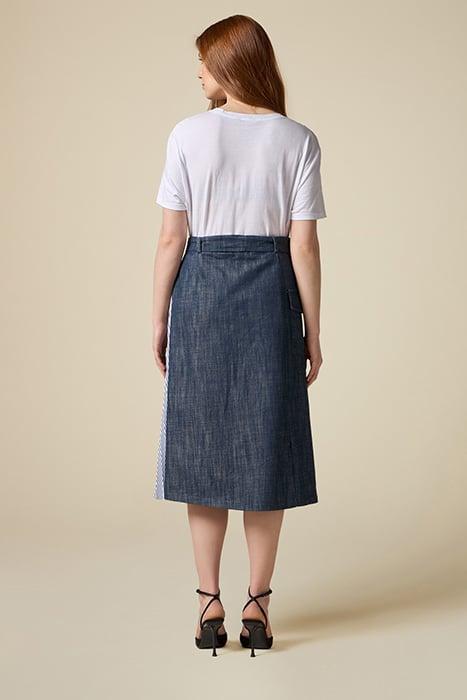 100% Cotton Slubbed Denim Midiskirt With Flared Line, Striped Pleated Poplin Side Insert, Oversized Side Pocket, Denim Sash To Tie In A Bow At The Waist