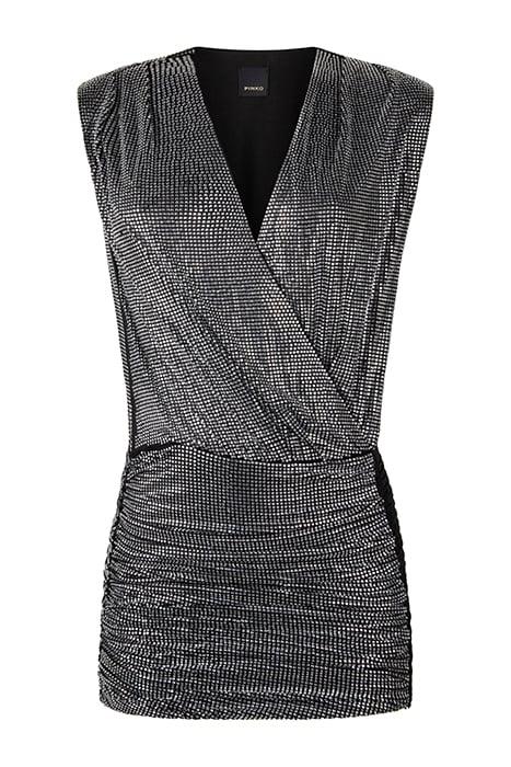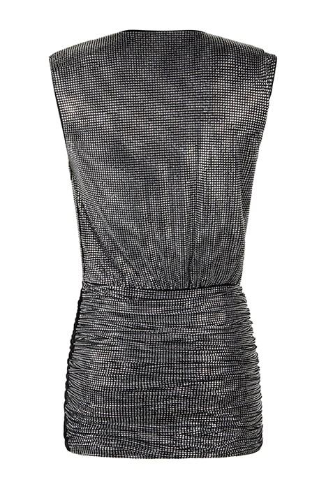 Sleeveless mini-dress in jersey embroidered all over with rhinestones. Crossover V neckline on the front, elasticated waist and figure hugging skirt with draped wraparound effect on the front. Model is 177cm tall and wears a size 40.
