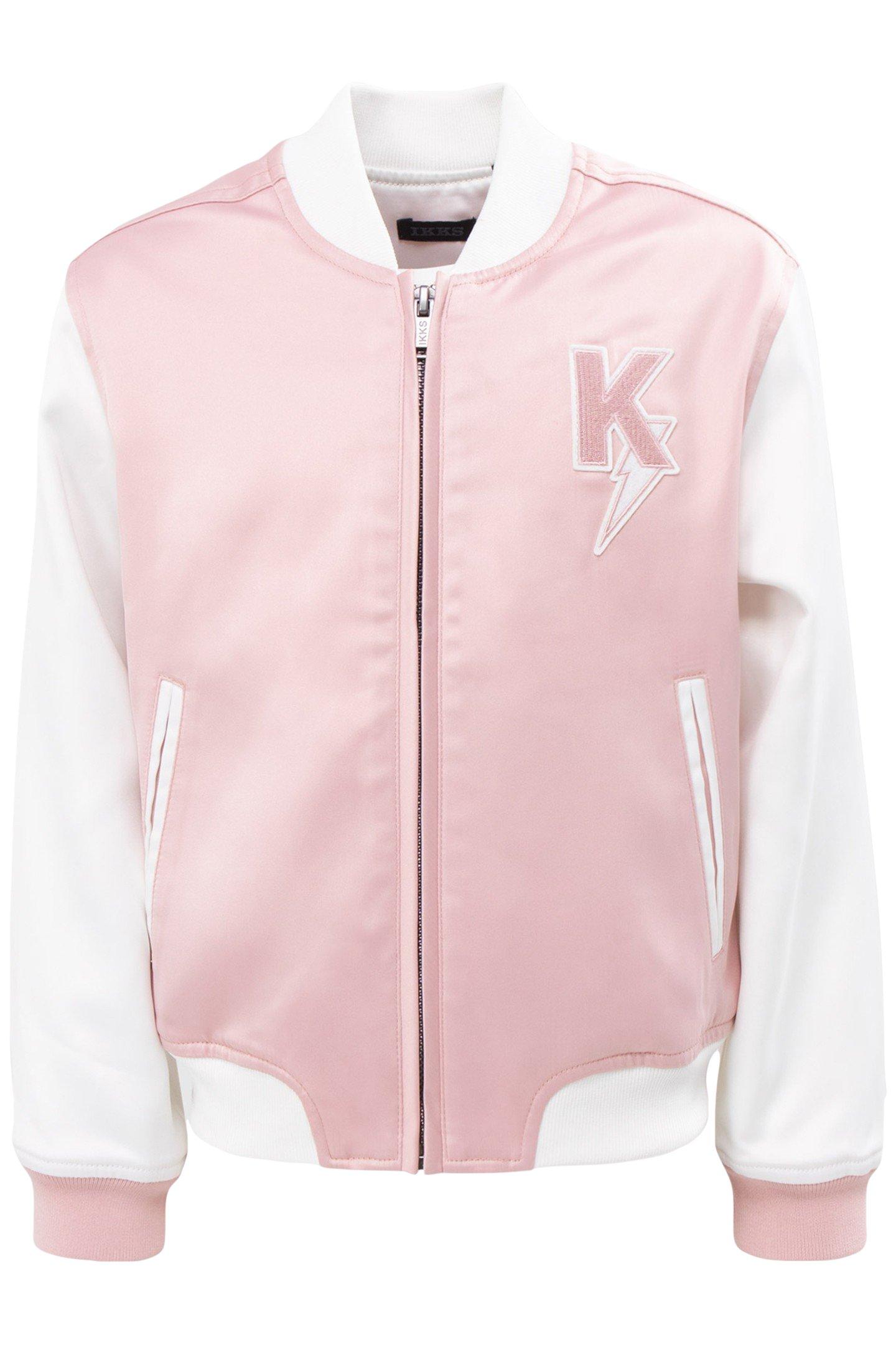 GIRLS’ PINK/WHITE VARSITY JACKET, BADGES AND EMBROIDERY