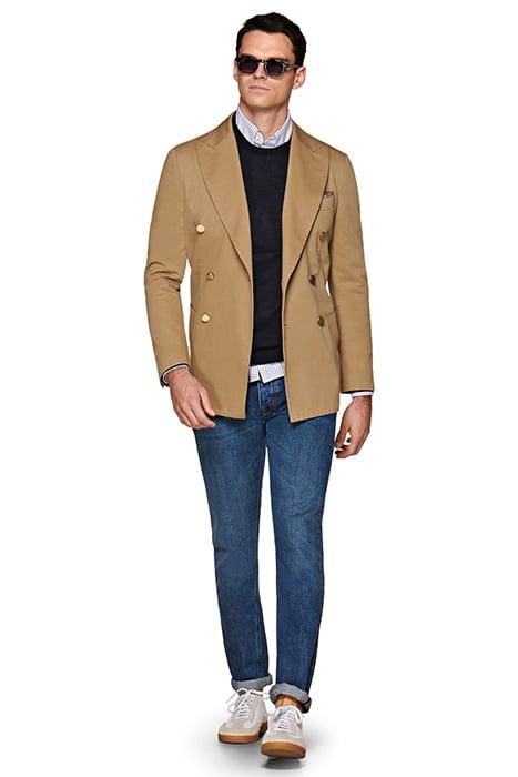 • A sharp double-breasted pick for any easygoing occasion, this lightweight khaki Havana is cut from pure washed cotton by the Santanderina mill. Tailored to our slim fit, it features a natural shoulder, patch pockets and distinctive gold buttons.