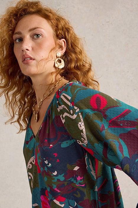 Brown, Ind, Versatile, Viscose, V Neck, Printed, Woven, Long Sleeve