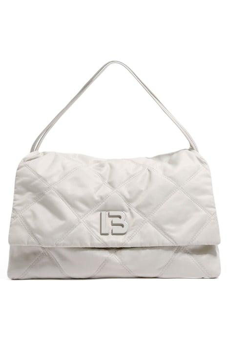 Padded Technical Fabric Shoulder Bag In Stone. Medium-Sized Model With Magnetic Flap Fastener And A Double Leather Strap. Exterior Customized Metal Lb Logo. 100% Recycled Polyester + 100% Recycled Polyamide.