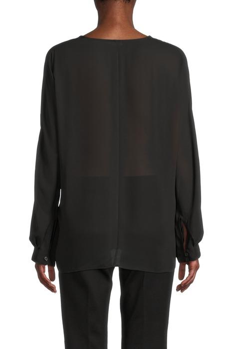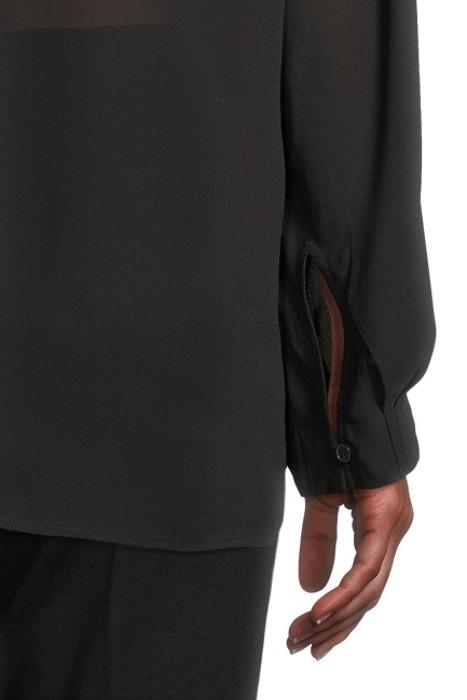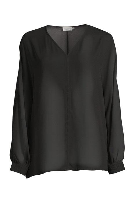 Voluminous chiffon blouse with a v-neck. Loose kimono sleeve construction drapes naturally over the body. Detailed with many small pleats at cuff.