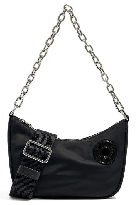 Nylon Half-Moon Crossbody Bag In Black. Small Model With Zip Fastener, Chain Handle And Removable Strap. Exterior Customized With Enamel Chimo Logo. This Model Contains 100% Recycled Polyester.