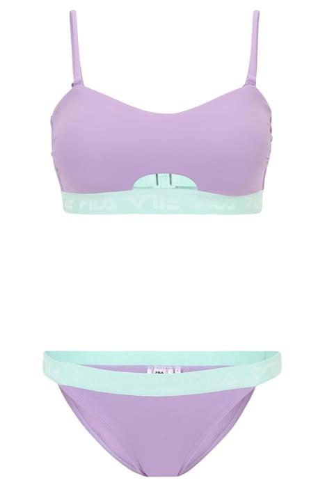 Bandeau Bikini In A Single Jersey Lycra Quality. Bandeau Shaped Bra Top With Adjustable And Removable Straps. Plastic Buckle For Closure At Back And Detailed With An Elastic Tape That Is Branded With The Fila Linear Logo. Combined With A Pair Of Regular Bottoms With The Same Branded Elastic Tape And Waistline.