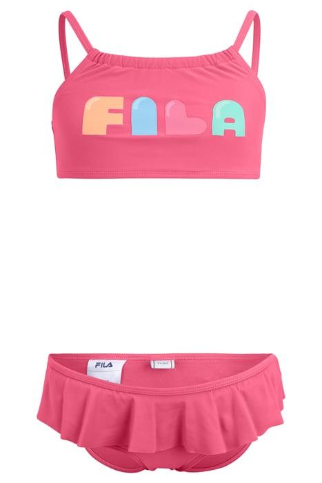 Girls Bikini Set With Ruffled Neckline And Fila-Front Print And Bottoms With Ruffles.