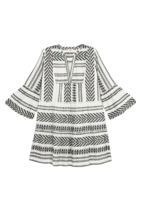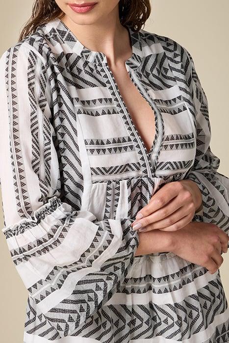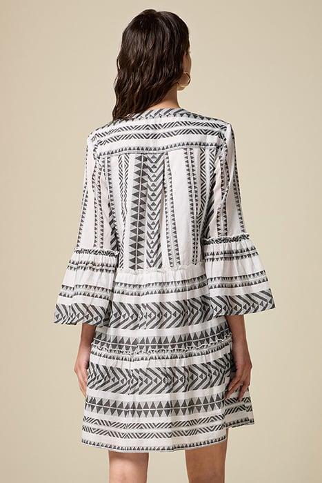 Short Dress In Fresh Cotton With Geometric Pattern, Flared Line, V-Neckline, Sleeves Flared At The Bottom, Inner Lining, Green Story Because Fibre Comes From Traceable Crops That Pay Attention To Environmental Biodiversity.