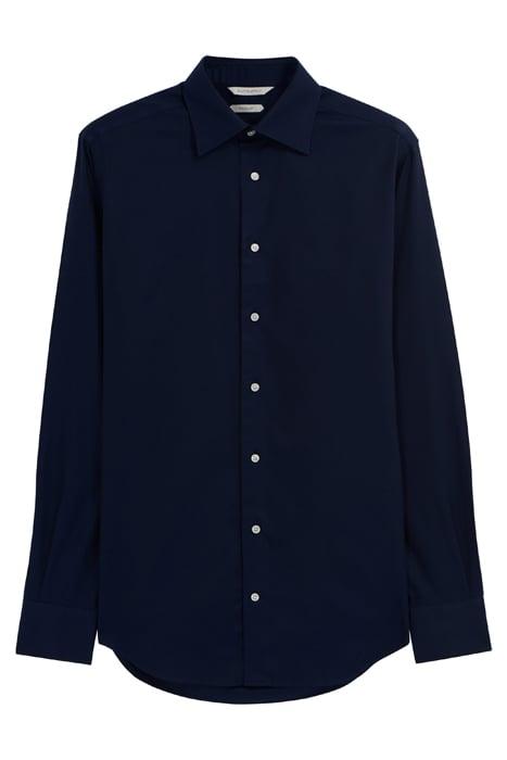 • Cut to a slim fit from crease-resistant Traveller cotton two-ply, this rich navy button-up shirt features a single cuff and classic collar.