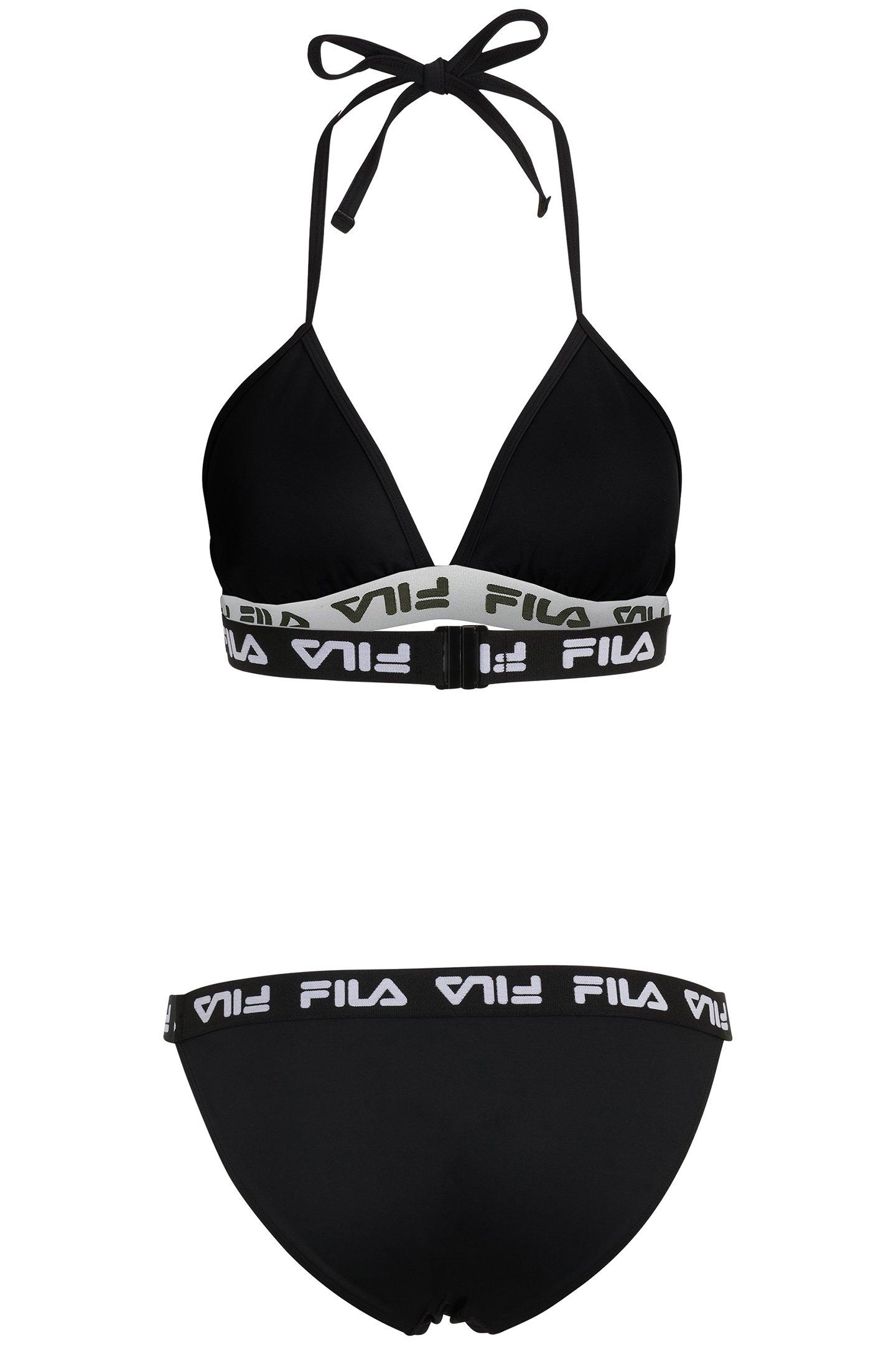 Triangle Bikini In A Single Jersey Lycra Quality. Triangle Shaped Bra Top With Removable Light Padding Inside, And With Regular Bottoms. Halter Neck Straps Around Neck And Plastic Buckle For Closure At Back. Detailed With An Elastic Tape That Is Branded With The Fila Linear Logo.