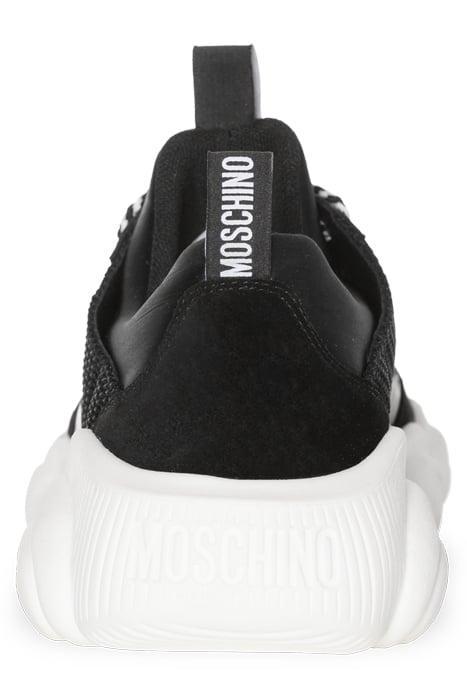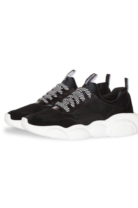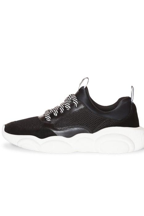The lace-up sneakers in mesh, calfskin and split leather are characterized by the new Teddy sole in the shape of Moschino Teddy Bear with the slogan This Is Not A Moschino Toy