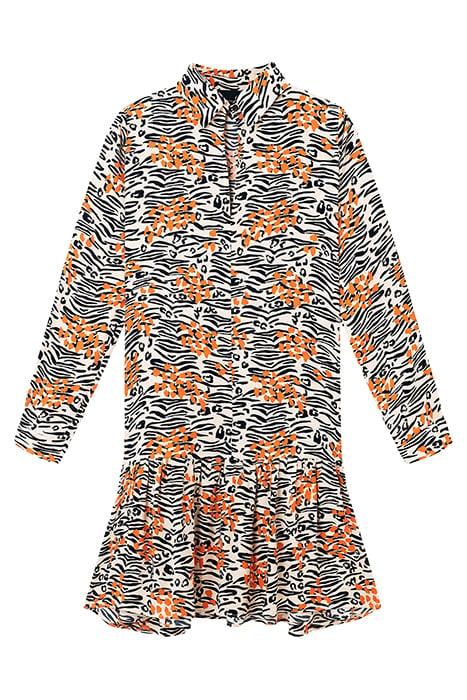 Short Loose Fit Dress With Volant Hem And Bottom Closure Collar, Long Sleeves With Buttom-Closure Sleeve Cuffs.