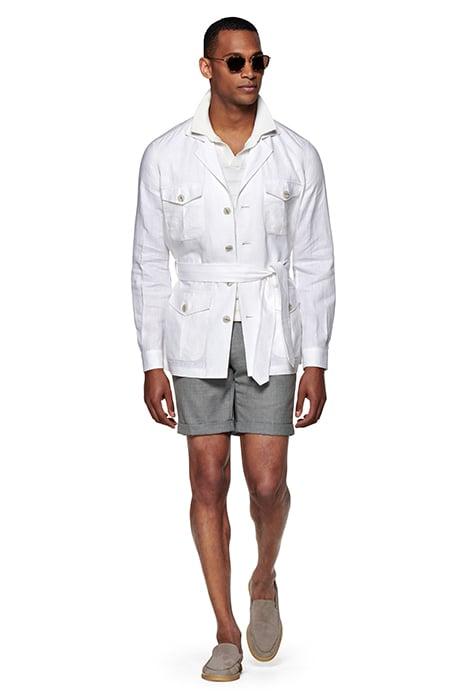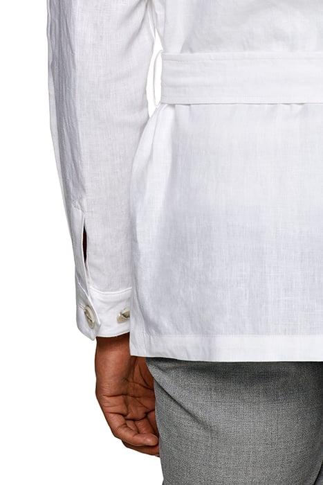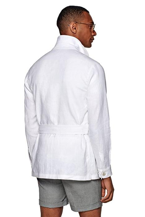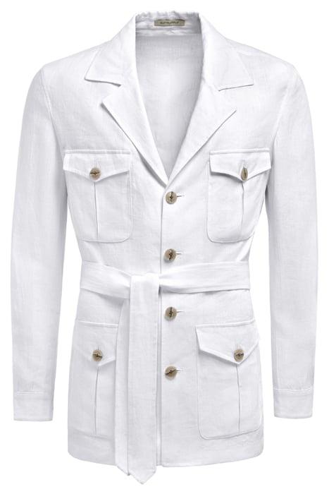 •This tailored, unconstructed white safari jacket is made from pure, breathable linen by the Baird McNutt mill and features a detachable belt.