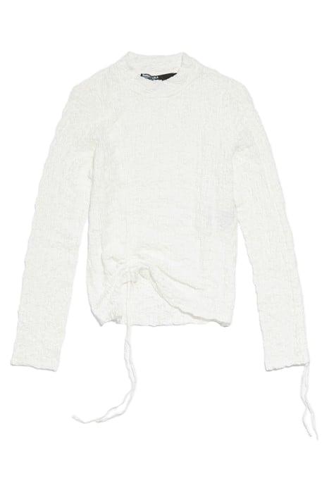 Textured Cotton T-Shirt In White. Fitted Design With Long Sleeve, Crew Neck And Ruched Side And Sleeve.